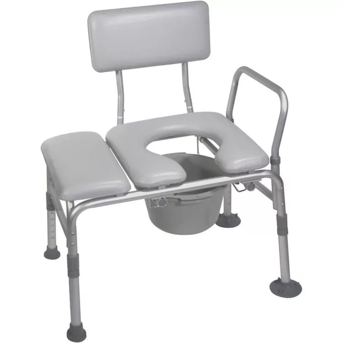 The Combination Padded Transfer Bench/Commode by Drive Medical features a durable and adjustable padded seat and backrest, 7.5 quart commode bucket, extra large locking suction cups and a new and improved “A” frame construction for added stability.