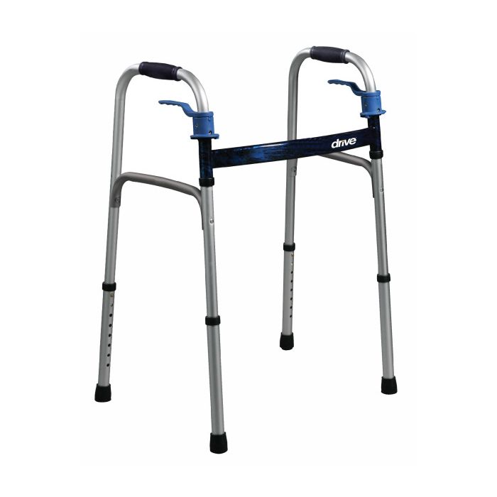 The Deluxe Trigger Release Folding Walker by Drive Medical features a crack resistant trigger release ideal for individuals with limited finger dexterity, which can be reached with hands of all sizes. This walker is available in two sizes.