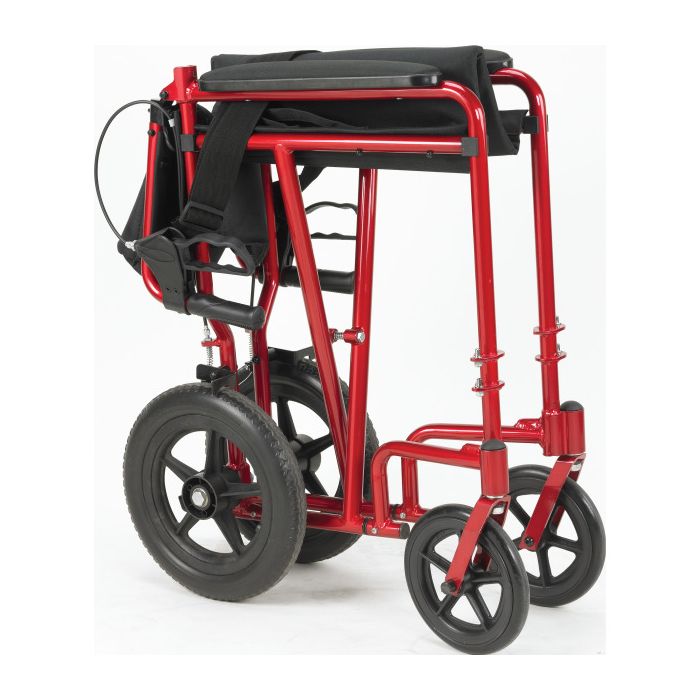- The Expedition Transport Chair is available in either blue or red frames, both with black upholstery.