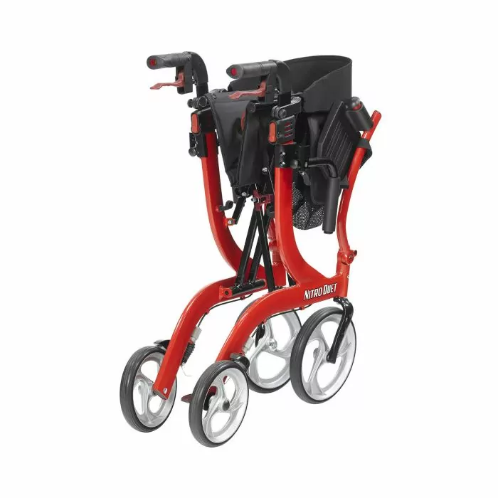 Easy side to side fold keeps the rollator in the standing position, making it easy to roll, park and store anywhere