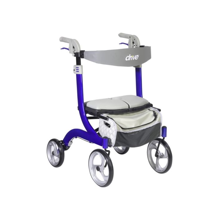 The Nitro DLX Rollator by Drive Medical is a Euro-style Rollator featuring a lightweight frame, large front casters and a flexible, height adjustable and removable back support for added safety and comfort.