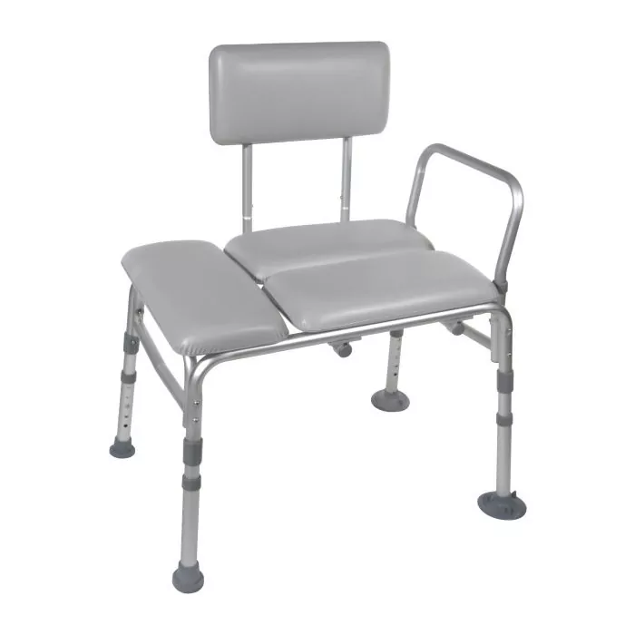 The Padded Transfer Bench by Drive Medical features a durable and adjustable padded seat and backrest, extra large locking suction cups and a new and improved “A” frame construction for added stability. This bench is easy to accommodate in any bathroom due to its tool-free reversible backrest.