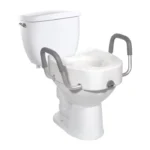 The Premium Plastic Raised Toilet Seat With Lock, Elongated features a wide opening in front and back for personal hygiene. It is designed for individuals who have difficulty sitting down or standing up from the toilet. The raised toilet seat includes removable arms and a sturdy locking mechanism for safety. It fits most elongated toilets.