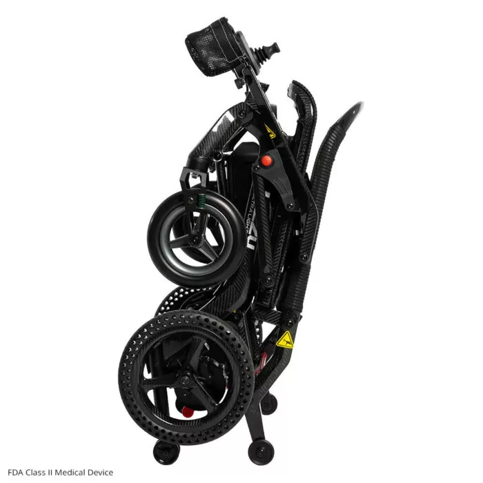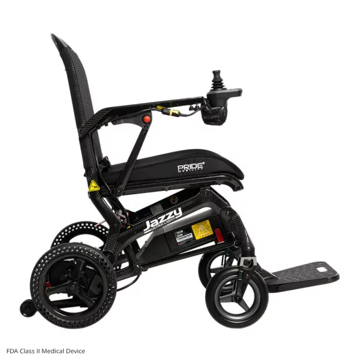The Jazzy® Ultra Light Folding Power Wheelchair is Pride Mobility’s lightest power chair yet- just 33 lbs without the battery. Made with a strong carbon fiber frame, it folds flat in seconds and travels up to 16.4 miles, offering unbeatable comfort and portability for active users on the go.